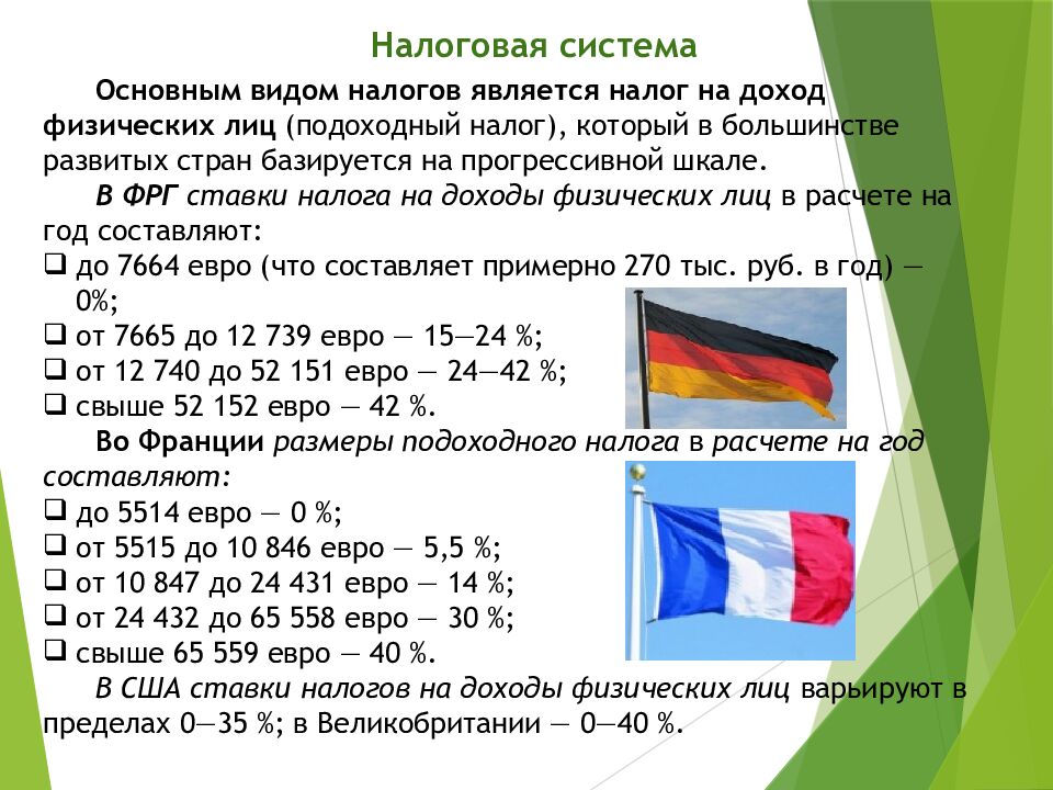 Основным видом налогов является налог на доход физических лиц (подоходный налог), который в большинстве развитых стран базируется на прогрессивной шкале. В ФРГ ставки налога на доходы физических лиц в расчете на год составляют: до 7664 евро (что составляет примерно 270 тыс. руб. в год) — 0%; от 7665 до 12 739 евро — 15—24 %; от 12 740 до 52 151 евро — 24—42 %; свыше 52 152 евро — 42 %. Во Франции размеры подоходного налога в расчете на год составляют : до 5514 евро — 0 %; от 5515 до 10 846 евро — 5,5 %; от 10 847 до 24 431 евро — 14 %; от 24 432 до 65 558 евро — 30 %; свыше 65 559 евро — 40 %. В США ставки налогов на доходы физических лиц варьируют в пределах 0—35 %; в Великобритании — 0—40 %.