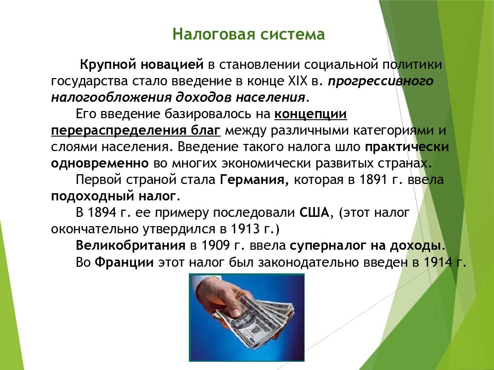 Крупной новацией в становлении социальной политики государства стало введение в конце XIX в. прогрессивного налогообложения доходов населения. Его введение базировалось на концепции перераспределения благ между различными категориями и слоями населения. Введение такого налога шло практически одновременно во многих экономически развитых странах. Первой страной стала Германия, которая в 1891 г. ввела подоходный налог. В 1894 г. ее примеру последовали США, (этот налог окончательно утвердился в 1913 г.) Великобритания в 1909 г. ввела суперналог на доходы. Во Франции этот налог был законодательно введен в 1914 г.