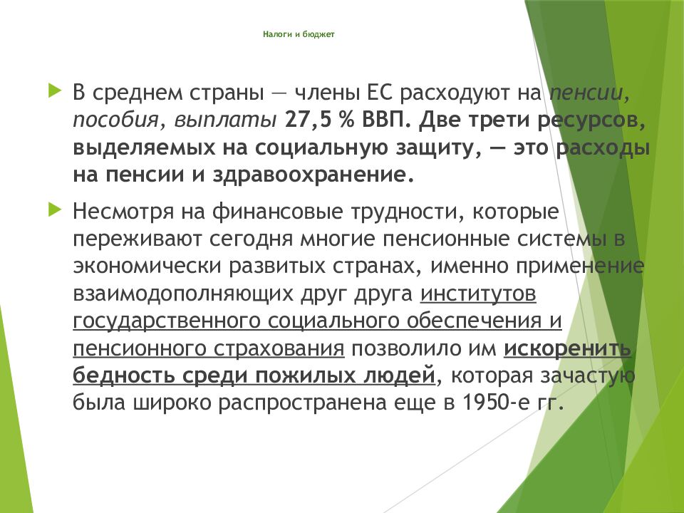 В среднем страны — члены ЕС расходуют на пенсии, пособия, выплаты 27,5 % ВВП. Две трети ресурсов, выделяемых на социальную защиту, — это расходы на пенсии и здравоохранение. Несмотря на финансовые трудности, которые переживают сегодня многие пенсионные системы в экономически развитых странах, именно применение взаимодополняющих друг друга институтов государственного социального обеспечения и пенсионного страхования позволило им искоренить бедность среди пожилых людей, которая зачастую была широко распространена еще в 1950-е гг.