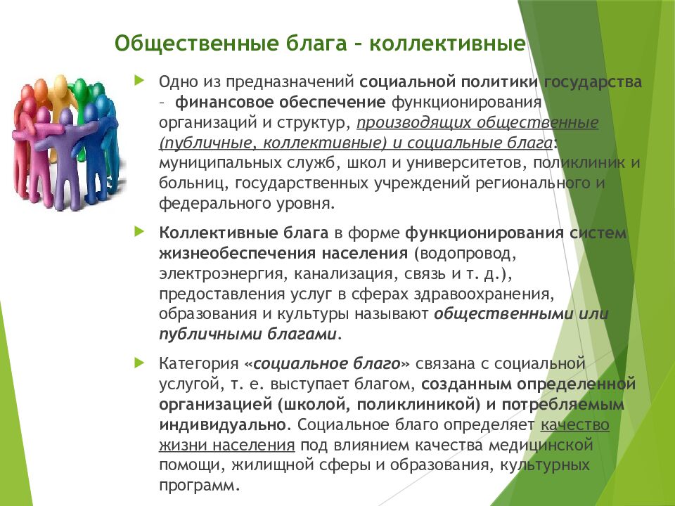 Одно из предназначений социальной политики государства – финансовое обеспечение функционирования организаций и структур, производящих общественные (публичные, коллективные) и социальные блага : муниципальных служб, школ и университетов, поликлиник и больниц, государственных учреждений регионального и федерального уровня. Коллективные блага в форме функционирования систем жизнеобеспечения населения (водопровод, электроэнергия, канализация, связь и т. д.), предоставления услуг в сферах здравоохранения, образования и культуры называют общественными или публичными благами. Категория «социальное благо » связана с социальной услугой, т. е. выступает благом, созданным определенной организацией (школой, поликлиникой) и потребляемым индивидуально. Социальное благо определяет качество жизни населения под влиянием качества медицинской помощи, жилищной сферы и образования, культурных программ.
