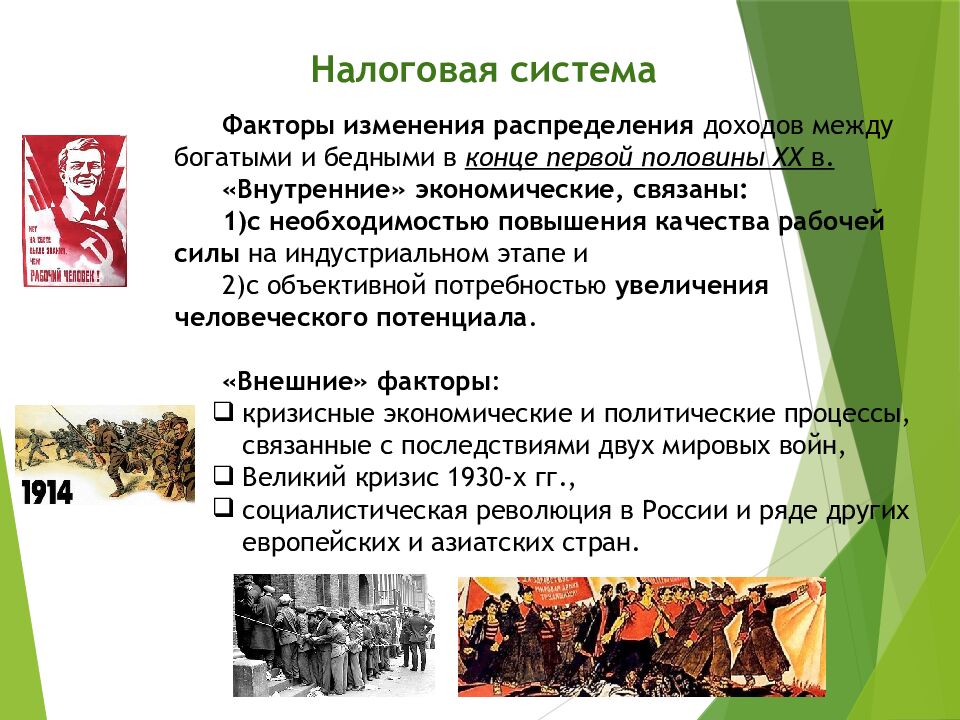 Факторы изменения распределения доходов между богатыми и бедными в конце первой половины XX в. «Внутренние» экономические, связаны: с необходимостью повышения качества рабочей силы на индустриальном этапе и с объективной потребностью увеличения человеческого потенциала. «Внешние » факторы : кризисные экономические и политические процессы, связанные с последствиями двух мировых войн, Великий кризис 1930-х гг., социалистическая революция в России и ряде других европейских и азиатских стран.