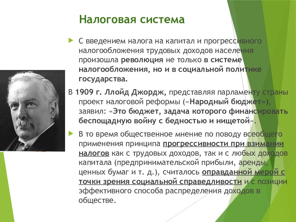 С введением налога на капитал и прогрессивного налогообложения трудовых доходов населения произошла революция не только в системе налогообложения, но и в социальной политике государства. В 1909 г. Ллойд Джордж, представляя парламенту страны проект налоговой реформы (« Народный бюджет»), заявил : « Это бюджет, задача которого финансировать беспощадную войну с бедностью и нищетой ». В то время общественное мнение по поводу всеобщего применения принципа прогрессивности при взимании налогов как с трудовых доходов, так и с любых доходов капитала (предпринимательской прибыли, аренды, ценных бумаг и т. д.), считалось оправданной мерой с точки зрения социальной справедливости и с позиции эффективного способа распределения доходов в обществе.