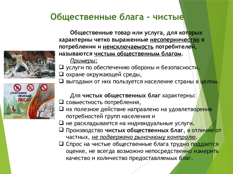 Общественные товар или услуга, для которых характерны четко выраженные несоперничество в потреблении и неисключаемость потребителей, называются чистым общественным благом. Примеры: услуги по обеспечению обороны и безопасности, охране окружающей среды, выгодами от них пользуется население страны в целом. Для чистых общественных благ характерны: совместность потребления, их полезное действие направлено на удовлетворение потребностей групп населения и не раскладывается на индивидуальные услуги. Производство чистых общественных благ, в отличие от частных, не подвержено рыночному контролю. Спрос на чистые общественные блага трудно поддается оценке, не всегда возможно непосредственно измерить качество и количество предоставляемых благ.