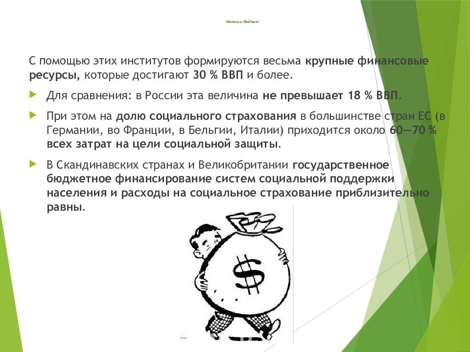 С помощью этих институтов формируются весьма крупные финансовые ресурсы, которые достигают 30 % ВВП и более. Для сравнения: в России эта величина не превышает 18 % ВВП. При этом на долю социального страхования в большинстве стран ЕС (в Германии, во Франции, в Бельгии, Италии) приходится около 60—70 % всех затрат на цели социальной защиты. В Скандинавских странах и Великобритании государственное бюджетное финансирование систем социальной поддержки населения и расходы на социальное страхование приблизительно равны.