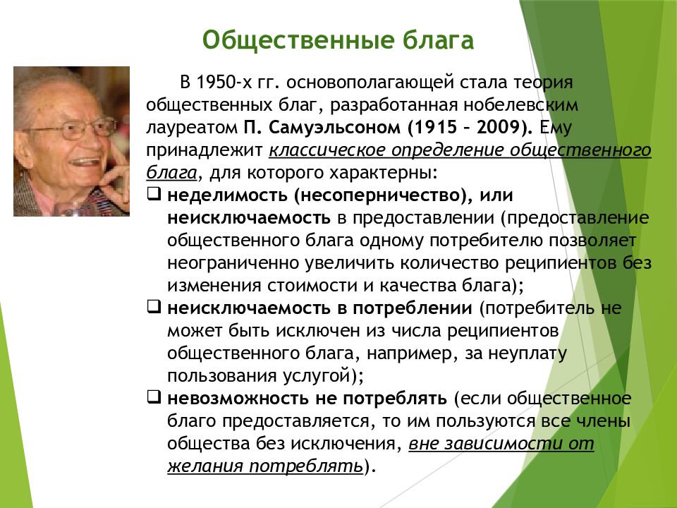 В 1950-х гг. основополагающей стала теория общественных благ, разработанная нобелевским лауреатом П. Самуэльсоном (1915 – 2009). Ему принадлежит классическое определение общественного блага, для которого характерны: неделимость (несоперничество), или неисключаемость в предоставлении (предоставление общественного блага одному потребителю позволяет неограниченно увеличить количество реципиентов без изменения стоимости и качества блага); неисключаемость в потреблении (потребитель не может быть исключен из числа реципиентов общественного блага, например, за неуплату пользования услугой); невозможность не потреблять (если общественное благо предоставляется, то им пользуются все члены общества без исключения, вне зависимости от желания потреблять ).