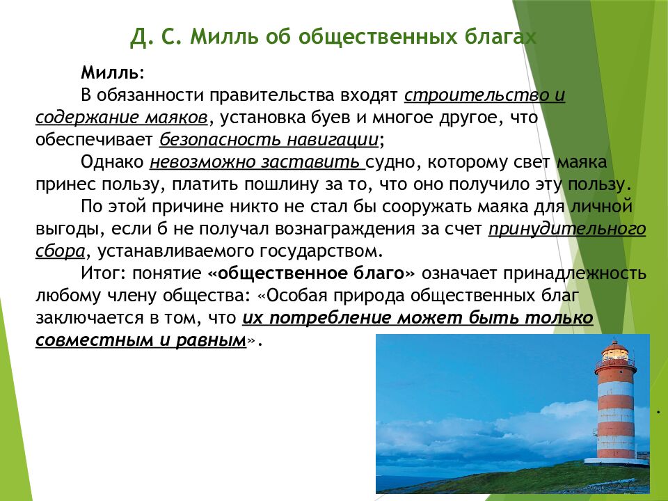 Милль : В обязанности правительства входят строительство и содержание маяков, установка буев и многое другое, что обеспечивает безопасность навигации ; Однако невозможно заставить судно, которому свет маяка принес пользу, платить пошлину за то, что оно получило эту пользу. По этой причине никто не стал бы сооружать маяка для личной выгоды, если б не получал вознаграждения за счет принудительного сбора, устанавливаемого государством. Итог: понятие «общественное благо» означает принадлежность любому члену общества: «Особая природа общественных благ заключается в том, что их потребление может быть только совместным и равным ». .