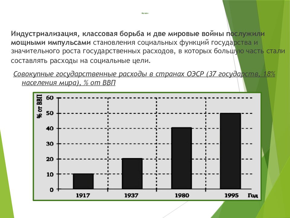 Индустриализация, классовая борьба и две мировые войны послужили мощными импульсами становления социальных функций государства и значительного роста государственных расходов, в которых большую часть стали составлять расходы на социальные цели. Совокупные государственные расходы в странах ОЭСР (37 государств, 18% населения мира), % от ВВП