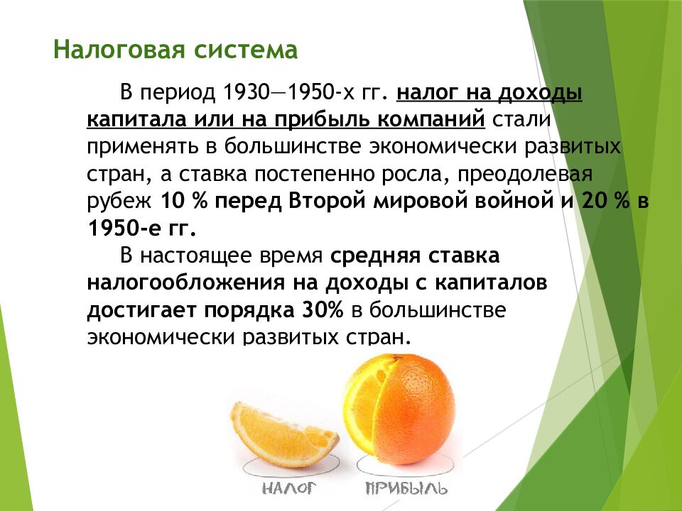 В период 1930—1950-х гг. налог на доходы капитала или на прибыль компаний стали применять в большинстве экономически развитых стран, а ставка постепенно росла, преодолевая рубеж 10 % перед Второй мировой войной и 20 % в 1950-е гг. В настоящее время средняя ставка налогообложения на доходы с капиталов достигает порядка 30% в большинстве экономически развитых стран.
