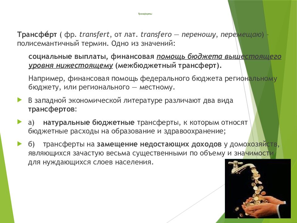 Трансфе́рт ( фр. transfert, от лат. transfero — переношу, перемещаю ) – полисемантичный термин. Одно из значений: социальные выплаты, финансовая помощь бюджета вышестоящего уровня нижестоящему (межбюджетный трансферт). Например, финансовая помощь федерального бюджета региональному бюджету, или регионального — местному. В западной экономической литературе различают два вида трансфертов : а) натуральные бюджетные трансферты, к которым относят бюджетные расходы на образование и здравоохранение; б) трансферты на замещение недостающих доходов у домохозяйств, являющихся зачастую весьма существенными по объему и значимости для нуждающихся слоев населения.