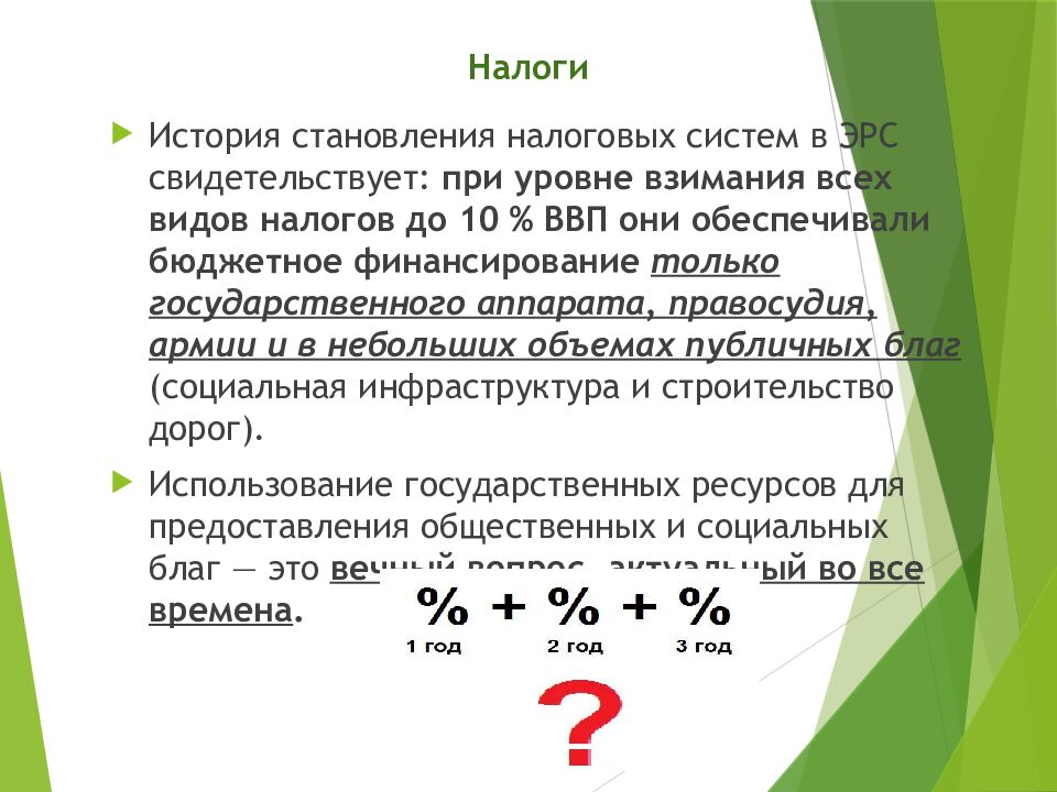 История становления налоговых систем в ЭРС свидетельствует: при уровне взимания всех видов налогов до 10 % ВВП они обеспечивали бюджетное финансирование только государственного аппарата, правосудия, армии и в небольших объемах публичных благ (социальная инфраструктура и строительство дорог). Использование государственных ресурсов для предоставления общественных и социальных благ — это вечный вопрос, актуальный во все времена.