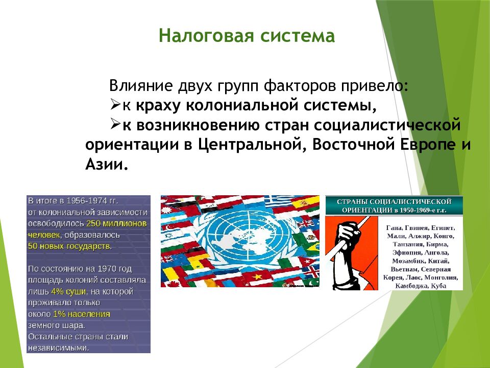 Влияние двух групп факторов привело: к краху колониальной системы, к возникновению стран социалистической ориентации в Центральной, Восточной Европе и Азии.