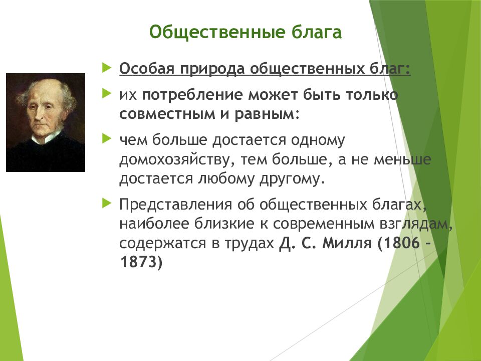 Особая природа общественных благ: их потребление может быть только совместным и равным : чем больше достается одному домохозяйству, тем больше, а не меньше достается любому другому. Представления об общественных благах, наиболее близкие к современным взглядам, содержатся в трудах Д. С. Милля (1806 – 1873)