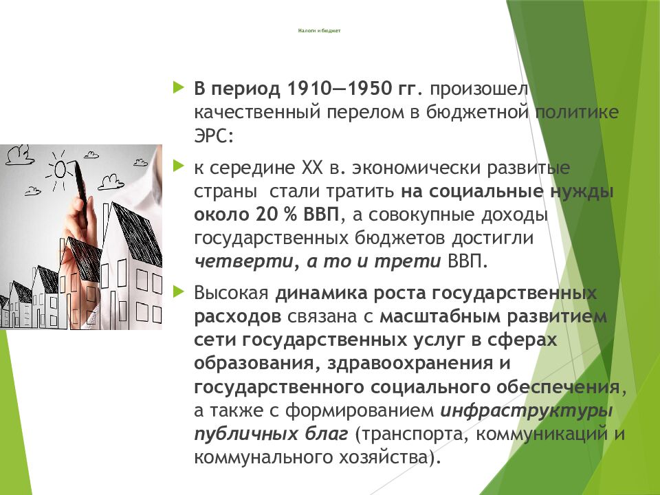 В период 1910—1950 гг. произошел качественный перелом в бюджетной политике ЭРС: к середине XX в. экономически развитые страны стали тратить на социальные нужды около 20 % ВВП, а совокупные доходы государственных бюджетов достигли четверти, а то и трети ВВП. Высокая динамика роста государственных расходов связана с масштабным развитием сети государственных услуг в сферах образования, здравоохранения и государственного социального обеспечения, а также с формированием инфраструктуры публичных благ (транспорта, коммуникаций и коммунального хозяйства).