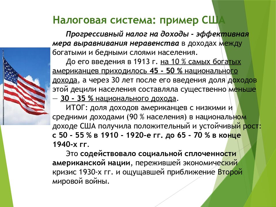 Прогрессивный налог на доходы - эффективная мера выравнивания неравенства в доходах между богатыми и бедными слоями населения. До его введения в 1913 г. на 10 % самых богатых американцев приходилось 45 - 50 % национального дохода, а через 30 лет после его введения доля доходов этой децили населения составляла существенно меньше — 30 - 35 % национального дохода. ИТОГ: доля доходов американцев с низкими и средними доходами (90 % населения) в национальном доходе США получила положительный и устойчивый рост: с 50 - 55 % в 1910 - 1920-е гг. до 65 - 70 % в конце 1940-х гг. Это содействовало социальной сплоченности американской нации, пережившей экономический кризис 1930-х гг. и ощущавшей приближение Второй мировой войны.