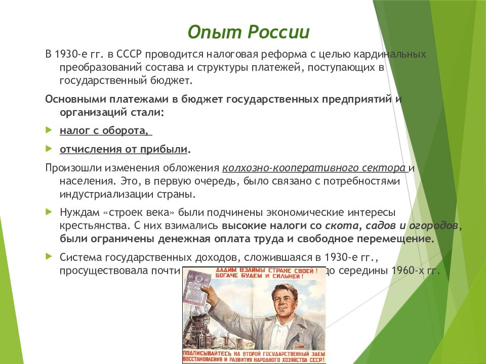 В 1930-е гг. в СССР проводится налоговая реформа с целью кардинальных преобразований состава и структуры платежей, поступающих в государственный бюджет. Основными платежами в бюджет государственных предприятий и организаций стали: налог с оборота, отчисления от прибыли. Произошли изменения обложения колхозно-кооперативного сектора и населения. Это, в первую очередь, было связано с потребностями индустриализации страны. Нуждам «строек века» были подчинены экономические интересы крестьянства. С них взимались высокие налоги со скота, садов и огородов, были ограничены денежная оплата труда и свободное перемещение. Система государственных доходов, сложившаяся в 1930-е гг., просуществовала почти в неизменном виде вплоть до середины 1960-х гг.
