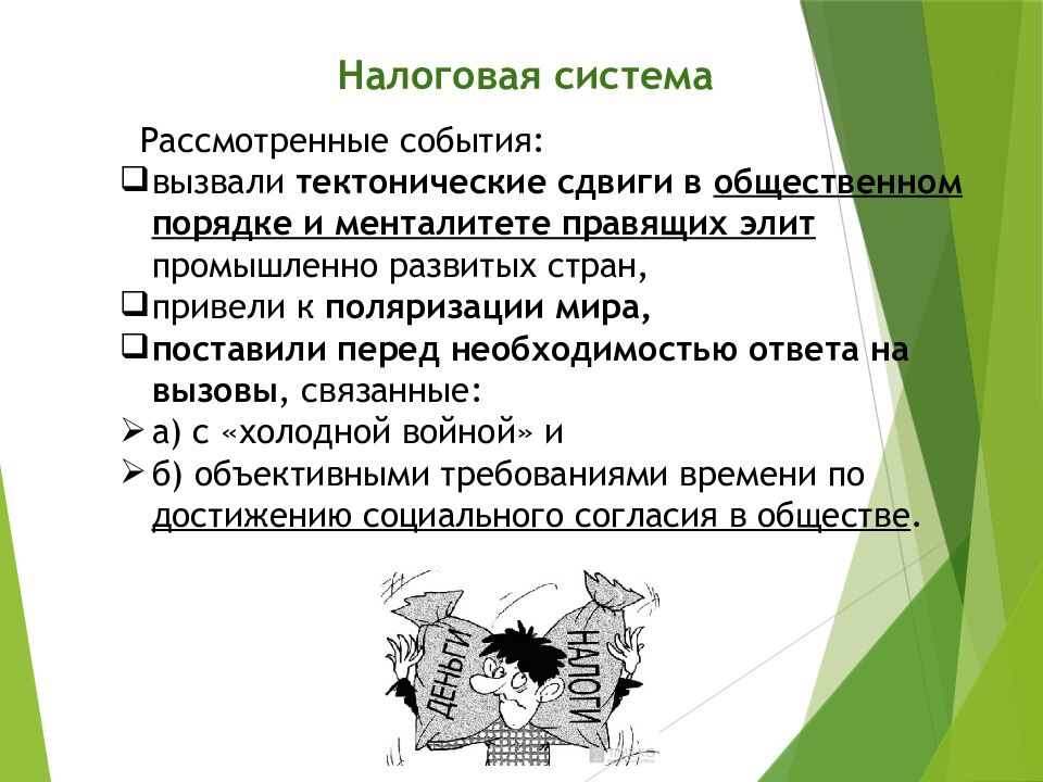 Рассмотренные события: вызвали тектонические сдвиги в общественном порядке и менталитете правящих элит промышленно развитых стран, привели к поляризации мира, поставили перед необходимостью ответа на вызовы, связанные: а) с «холодной войной » и б) объективными требованиями времени по достижению социального согласия в обществе.