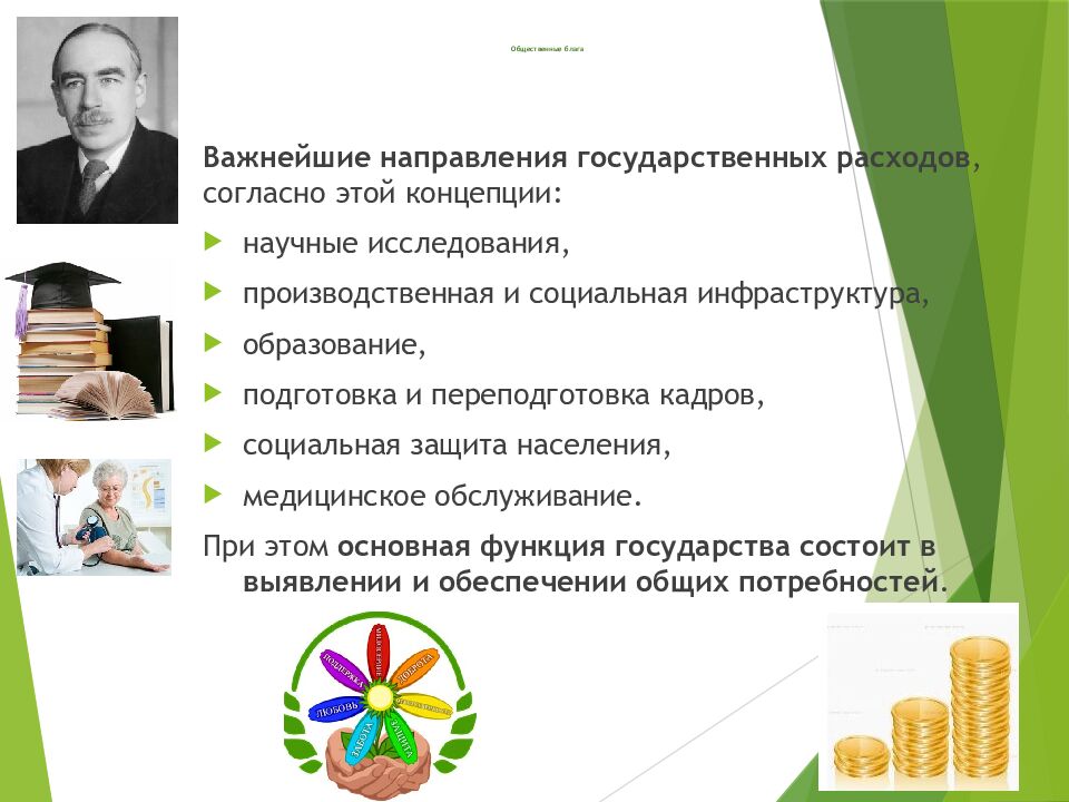 Важнейшие направления государственных расходов, согласно этой концепции: научные исследования, производственная и социальная инфраструктура, образование, подготовка и переподготовка кадров, социальная защита населения, медицинское обслуживание. При этом основная функция государства состоит в выявлении и обеспечении общих потребностей.