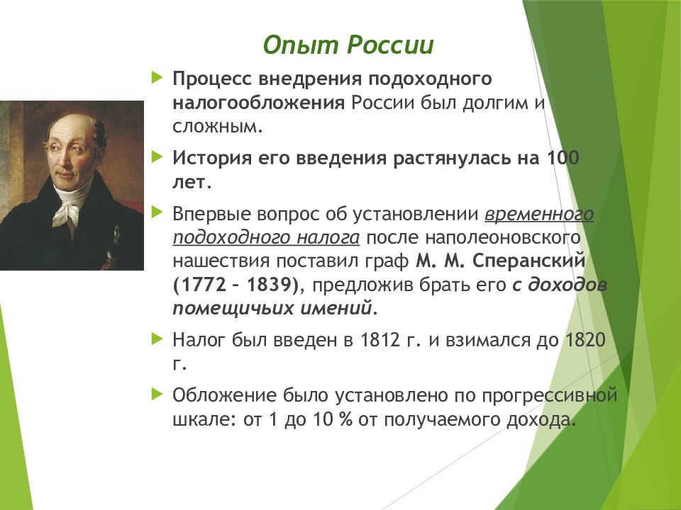 Процесс внедрения подоходного налогообложения России был долгим и сложным. История его введения растянулась на 100 лет. Впервые вопрос об установлении временного подоходного налога после наполеоновского нашествия поставил граф М. М. Сперанский (1772 – 1839), предложив брать его с доходов помещичьих имений. Налог был введен в 1812 г. и взимался до 1820 г. Обложение было установлено по прогрессивной шкале: от 1 до 10 % от получаемого дохода.