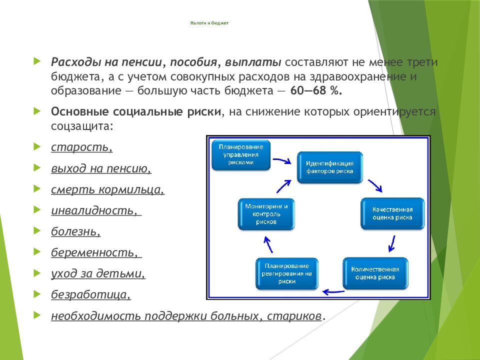 Расходы на пенсии, пособия, выплаты составляют не менее трети бюджета, а с учетом совокупных расходов на здравоохранение и образование — большую часть бюджета — 60—68 %. Основные социальные риски, на снижение которых ориентируется соцзащита: старость, выход на пенсию, смерть кормильца, инвалидность, болезнь, беременность, уход за детьми, безработица, необходимость поддержки больных, стариков.