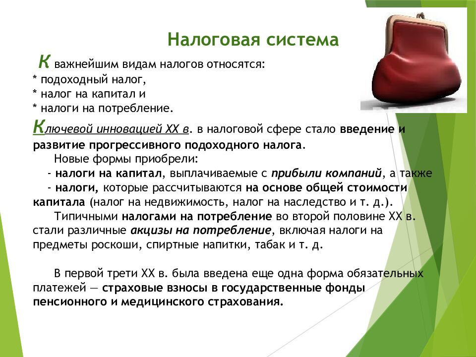 С введением налога на капитал и прогрессивного налогообложения трудовых доходов населения произошла революция не только в системе налогообложения, но и в социальной политике государства. О кончательное оформление получила новая парадигма социального государства, базирующаяся: на его социальной ответственности за благосостояние граждан, на применении механизмов социального бюджетирования.