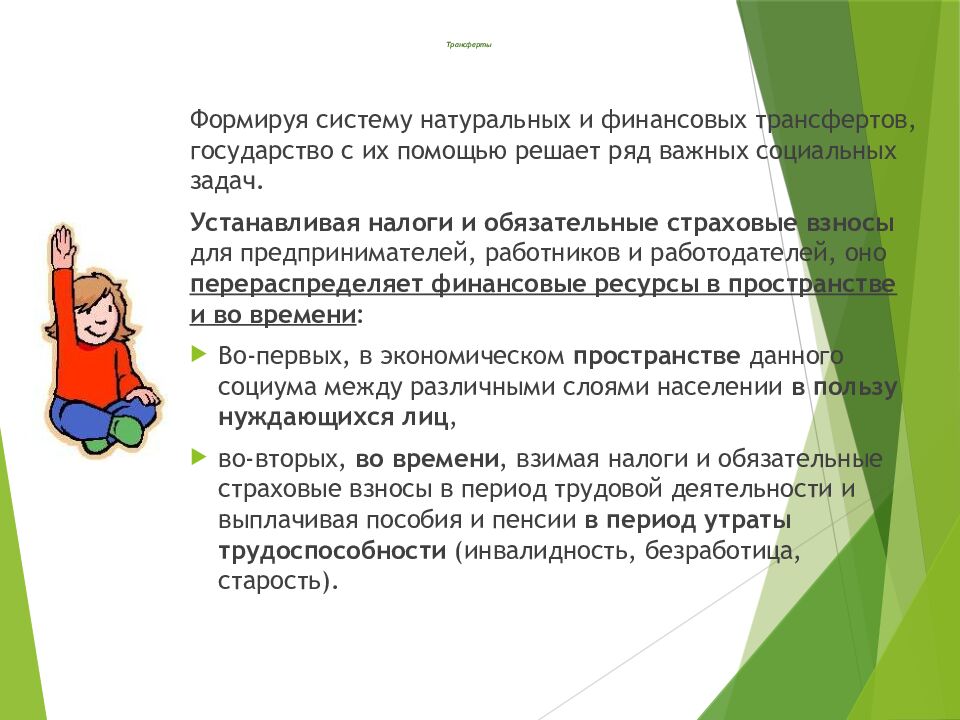 Формируя систему натуральных и финансовых трансфертов, государство с их помощью решает ряд важных социальных задач. Устанавливая налоги и обязательные страховые взносы для предпринимателей, работников и работодателей, оно перераспределяет финансовые ресурсы в пространстве и во времени : Во-первых, в экономическом пространстве данного социума между различными слоями населении в пользу нуждающихся лиц, во-вторых, во времени, взимая налоги и обязательные страховые взносы в период трудовой деятельности и выплачивая пособия и пенсии в период утраты трудоспособности (инвалидность, безработица, старость).