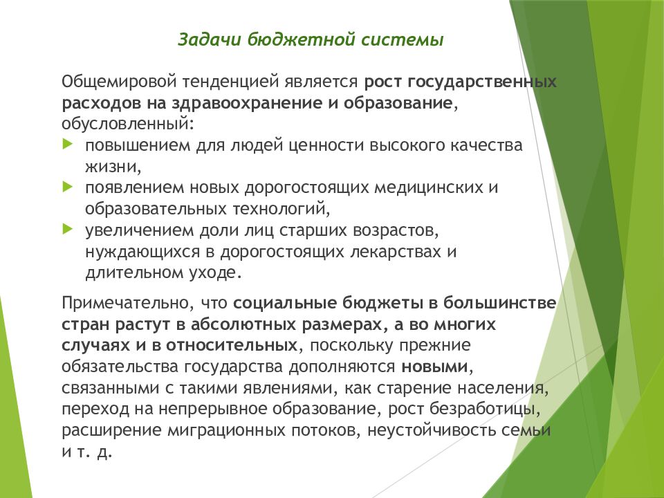 Общемировой тенденцией является рост государственных расходов на здравоохранение и образование, обусловленный: повышением для людей ценности высокого качества жизни, появлением новых дорогостоящих медицинских и образовательных технологий, увеличением доли лиц старших возрастов, нуждающихся в дорогостоящих лекарствах и длительном уходе. Примечательно, что социальные бюджеты в большинстве стран растут в абсолютных размерах, а во многих случаях и в относительных, поскольку прежние обязательства государства дополняются новыми, связанными с такими явлениями, как старение населения, переход на непрерывное образование, рост безработицы, расширение миграционных потоков, неустойчивость семьи и т. д.