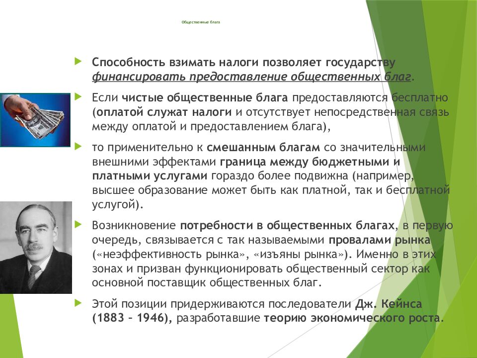 Способность взимать налоги позволяет государству финансировать предоставление общественных благ. Если чистые общественные блага предоставляются бесплатно ( оплатой служат налоги и отсутствует непосредственная связь между оплатой и предоставлением блага), то применительно к смешанным благам со значительными внешними эффектами граница между бюджетными и платными услугами гораздо более подвижна (например, высшее образование может быть как платной, так и бесплатной услугой). Возникновение потребности в общественных благах, в первую очередь, связывается с так называемыми провалами рынка (« неэффективность рынка», « изъяны рынка»). Именно в этих зонах и призван функционировать общественный сектор как основной поставщик общественных благ. Этой позиции придерживаются последователи Дж. Кейнса (1883 – 1946), разработавшие теорию экономического роста.