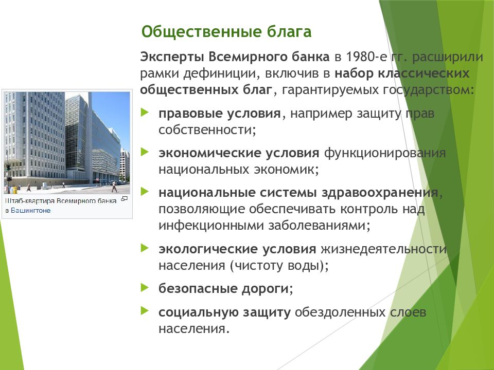 Эксперты Всемирного банка в 1980-е гг. расширили рамки дефиниции, включив в набор классических общественных благ, гарантируемых государством: правовые условия, например защиту прав собственности; экономические условия функционирования национальных экономик ; национальные системы здравоохранения, позволяющие обеспечивать контроль над инфекционными заболеваниями; экологические условия жизнедеятельности населения (чистоту воды); безопасные дороги ; социальную защиту обездоленных слоев населения.
