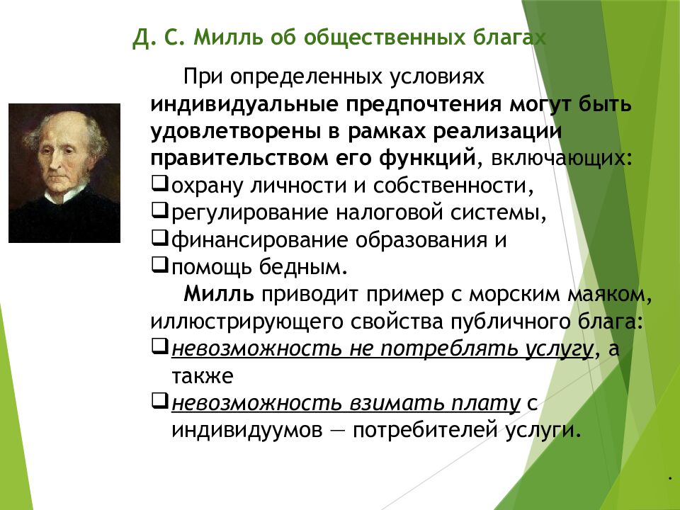 При определенных условиях индивидуальные предпочтения могут быть удовлетворены в рамках реализации правительством его функций, включающих: охрану личности и собственности, регулирование налоговой системы, финансирование образования и помощь бедным. Милль приводит пример с морским маяком, иллюстрирующего свойства публичного блага: невозможность не потреблять услугу, а также невозможность взимать плату с индивидуумов — потребителей услуги. .