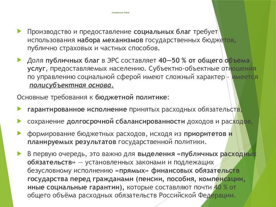 Производство и предоставление социальных благ требует использования набора механизмов государственных бюджетов, публично страховых и частных способов. Доля публичных благ в ЭРС составляет 40—50 % от общего объема услуг, предоставляемых населению. Субъектно-объектные отношения по управлению социальной сферой имеют сложный характер – имеется полисубъектная основа. Основные требования к бюджетной политике : гарантированное исполнение принятых расходных обязательств, сохранение долгосрочной сбалансированности доходов и расходов, формирование бюджетных расходов, исходя из приоритетов и планируемых результатов государственной политики. В первую очередь, это важно для выделения «публичных расходных обязательств» — установленных законами и подлежащих безусловному исполнению «прямых» финансовых обязательств государства перед гражданами (пенсии, пособия, компенсации, иные социальные гарантии ), которые составляют почти 40 % от общего объёма расходных обязательств Российской Федерации.
