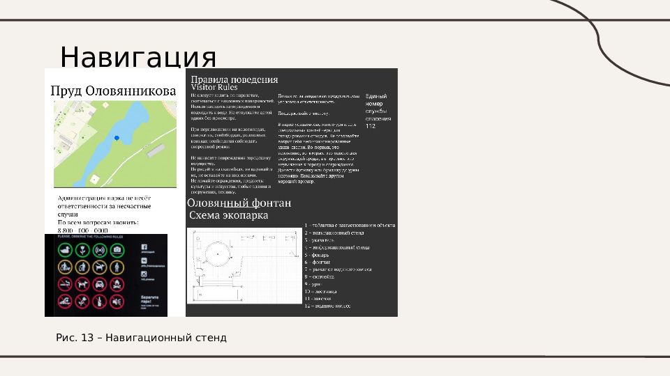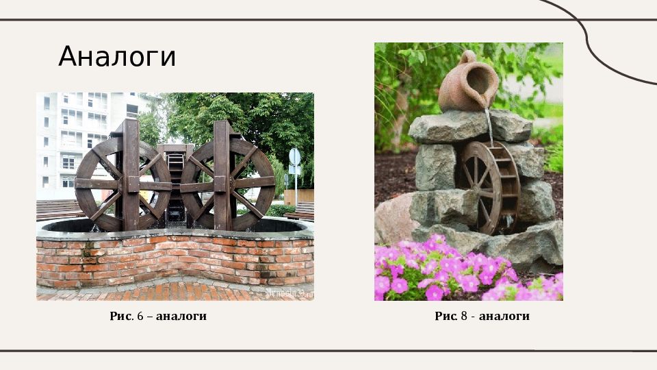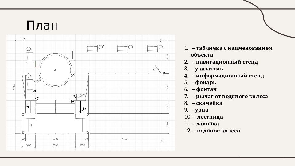 – табличка с наименованием объекта – навигационный стенд - указатель – информационный стенд - фонарь – фонтан – рычаг от водяного колеса – скамейка - урна – лестница - лавочка – водяное колесо