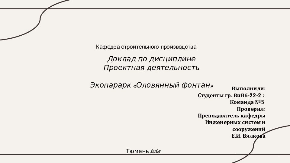 Выполнили: Студенты гр. ВиВб-22-2 : Команда №5 Проверил: Преподаватель кафедры Инженерных систем и сооружений Е.И. Вялкова Тюмень 2024 Кафедра строительного производства