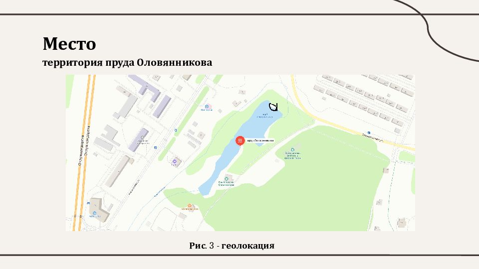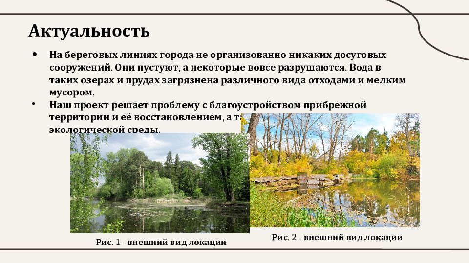 На береговых линиях города не организованно никаких досуговых сооружений. Они пустуют, а некоторые вовсе разрушаются. Вода в таких озерах и прудах загрязнена различного вида отходами и мелким мусором. Наш проект решает проблему с благоустройством прибрежной территории и её восстановлением, а также направлен на улучшение экологической среды. Рис. 1 - внешний вид локации Рис. 2 - внешний вид локации