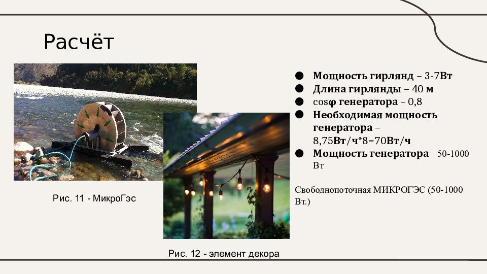 Мощность гирлянд – 3-7Вт Длина гирлянды – 40 м cos φ генератора – 0,8 Необходимая мощность генератора – 8,75Вт/ч*8=70Вт/ч Мощность генератора - 50-1000 Вт Свободнопоточная МИКРОГЭС (50-1000 Вт.) Рис. 11 - МикроГэс Рис. 12 - элемент декора