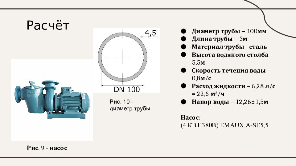 Диаметр трубы – 100мм Длина трубы – 3м Материал трубы - сталь Высота водяного столба – 5,5м Скорость течения воды – 0,8м/с Расход жидкости – 6,28 л/с = 22,6 м 3 /ч Напор воды – 12,26±1,5м Насос: (4 КВТ 380В) EMAUX А-SE5,5 Рис. 9 - насос Рис. 10 - диаметр трубы