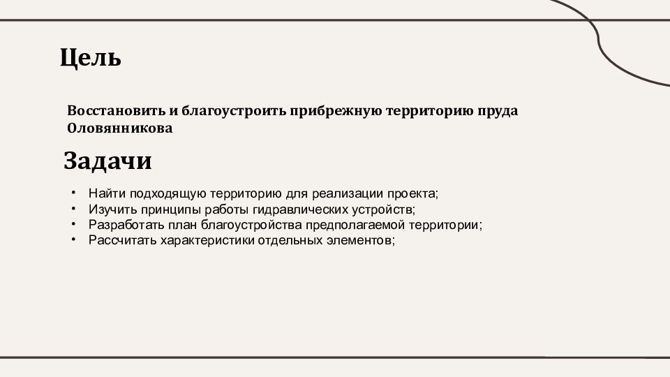 Восстановить и благоустроить прибрежную территорию пруда Оловянникова Задачи Найти подходящую территорию для реализации проекта; Изучить принципы работы гидравлических устройств; Разработать план благоустройства предполагаемой территории; Рассчитать характеристики отдельных элементов;