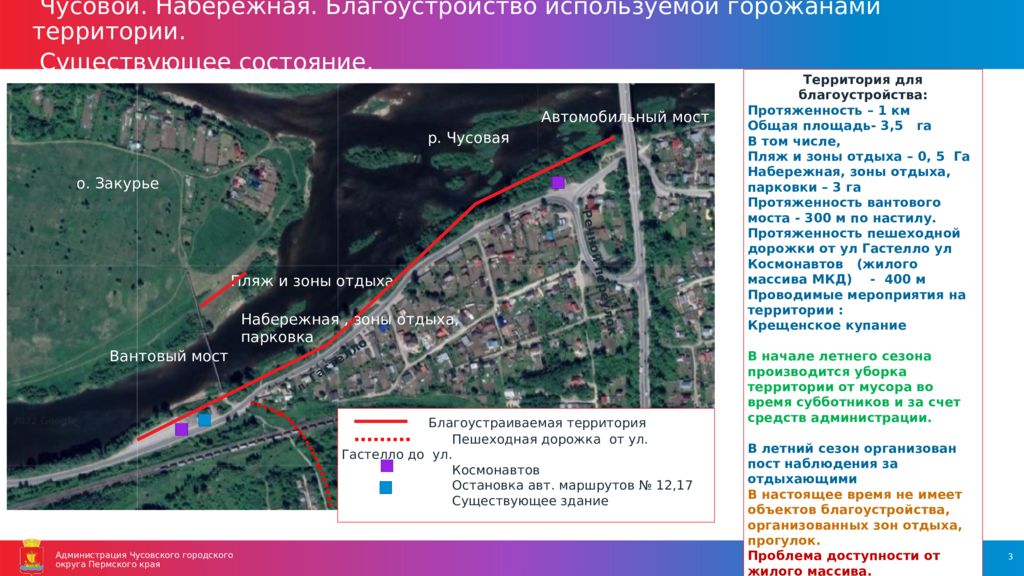 Администрация Чусовского городского округа Пермского края Чусовой. Набережная. Благоустройство используемой горожанами территории. Существующее состояние. Ул. Гастелло Территория для благоустройства: Протяженность – 1 км Общая площадь- 3,5 га В том числе, Пляж и зоны отдыха – 0, 5 Га Набережная, зоны отдыха, парковки – 3 га Протяженность вантового моста - 300 м по настилу. Протяженность пешеходной дорожки от ул Гастелло ул Космонавтов (жилого массива МКД) - 400 м Проводимые мероприятия на территории : Крещенское купание В начале летнего сезона производится уборка территории от мусора во время субботников и за счет средств администрации. В летний сезон организован пост наблюдения за отдыхающими В настоящее время не имеет объектов благоустройства, организованных зон отдыха, прогулок. Проблема доступности от жилого массива. Речной переулок р. Чусовая Автомобильный мост Благоустраиваемая территория Пешеходная дорожка от ул. Гастелло до ул. Космонавтов Остановка авт. маршрутов № 12,17 Существующее здание Пляж и зоны отдыха Набережная, зоны отдыха, парковка Вантовый мост о. Закурье
