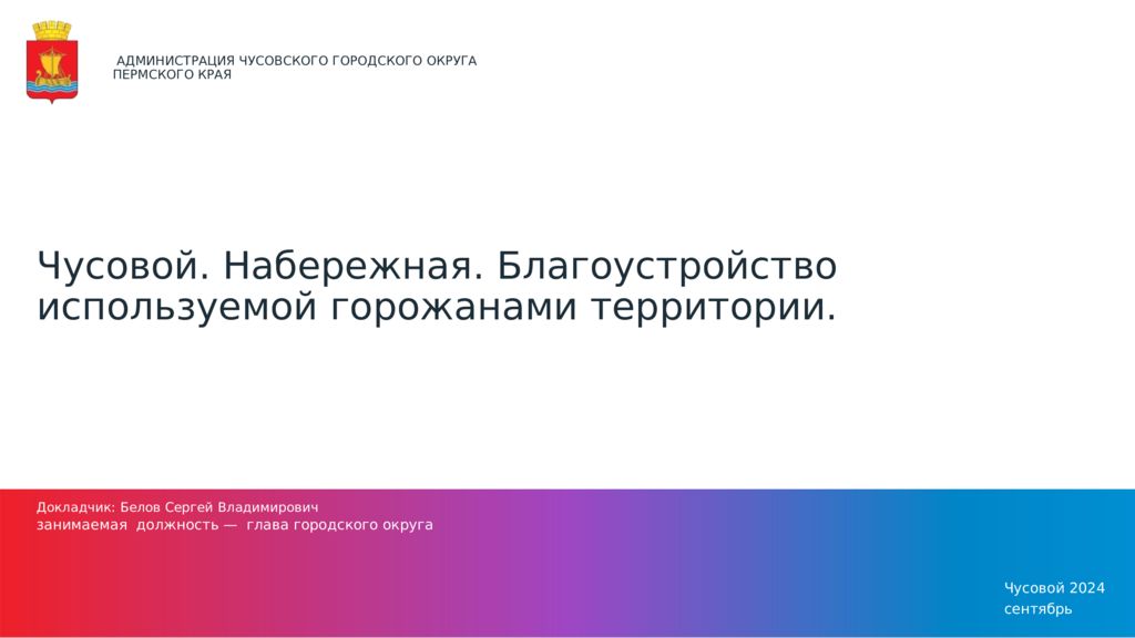 Докладчик : Белов Сергей Владимирович АДМИНИСТРАЦИЯ ЧУСОВСКОГО ГОРОДСКОГО ОКРУГА ПЕРМСКОГО КРАЯ Чусовой. Набережная. Благоустройство используемой горожанами территории. занимаемая должность — глава городского округа Чусовой 2024 сентябрь