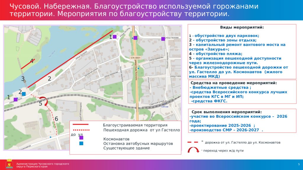 Администрация Чусовского городского округа Пермского края Чусовой. Набережная. Благоустройство используемой горожанами территории. Мероприятия по благоустройству территории. Виды мероприятий: 1 - обустройство двух парковок; 2 - обустройство зоны отдыха; 3 - капитальный ремонт вантового моста на остров «Закурье»; 4 - обустройство пляжа; 5 - организация пешеходной доступности через железнодорожные пути. 6- Благоустройство пешеходной дорожки от ул. Гастелло до ул. Космонавтов (жилого массива МКД) дорожка от ул. Гастелло до ул. Космонавтов переход через ж/д пути 1 1 2 2 3 4 5 Средства на проведение мероприятий: - Внебюджетные средства ; -средства Всероссийского конкурса лучших проектов КГС в МГ и ИП; -средства ФКГС. Срок выполнения мероприятий: -участие в о Всероссийском конкурсе – 2026 года; -проектирование 2025-2026 ; -производство СМР – 2026-2027. 6 Благоустраиваемая территория Пешеходная дорожка от ул Гастелло до ул Космонавтов Остановка автобусных маршрутов Существующее здание