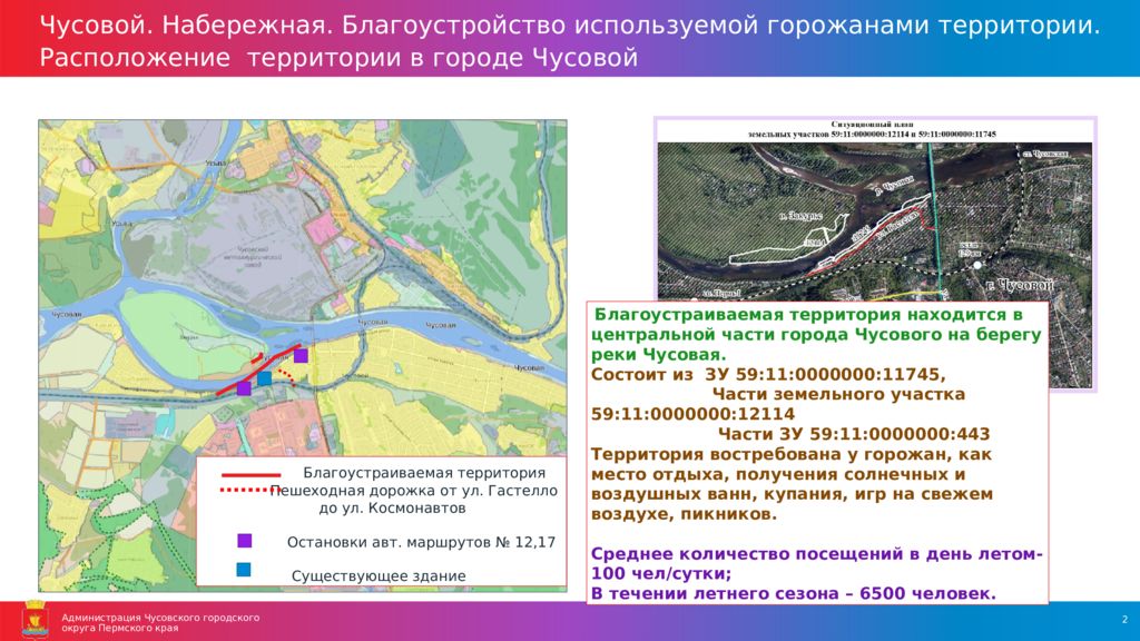 Чусовой. Набережная. Благоустройство используемой горожанами территории. Расположение территории в городе Чусовой Администрация Чусовского городского округа Пермского края Благоустраиваемая территория Пешеходная дорожка от ул. Гастелло до ул. Космонавтов Остановки авт. маршрутов № 12,17 Существующее здание Благоустраиваемая территория находится в центральной части города Чусового на берегу реки Чусовая. Состоит из ЗУ 59:11:0000000:11745, Части земельного участка 59:11:0000000:12114 Части ЗУ 59:11:0000000:443 Территория востребована у горожан, как место отдыха, получения солнечных и воздушных ванн, купания, игр на свежем воздухе, пикников. Среднее количество посещений в день летом- 100 чел/сутки; В течении летнего сезона – 6500 человек.