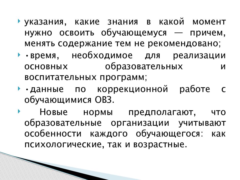 указания, какие знания в какой момент нужно освоить обучающемуся — причем, менять содержание тем не рекомендовано; •время, необходимое для реализации основных образовательных и воспитательных программ; •данные по коррекционной работе с обучающимися ОВЗ. Новые нормы предполагают, что образовательные организации учитывают особенности каждого обучающегося: как психологические, так и возрастные.