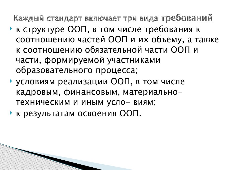 к структуре ООП, в том числе требования к соотношению частей ООП и их объему, а также к соотношению обязательной части ООП и части, формируемой участниками образовательного процесса; условиям реализации ООП, в том числе кадровым, финансовым, материально-техническим и иным усло - виям ; к результатам освоения ООП. Каждый стандарт включает три вида требований