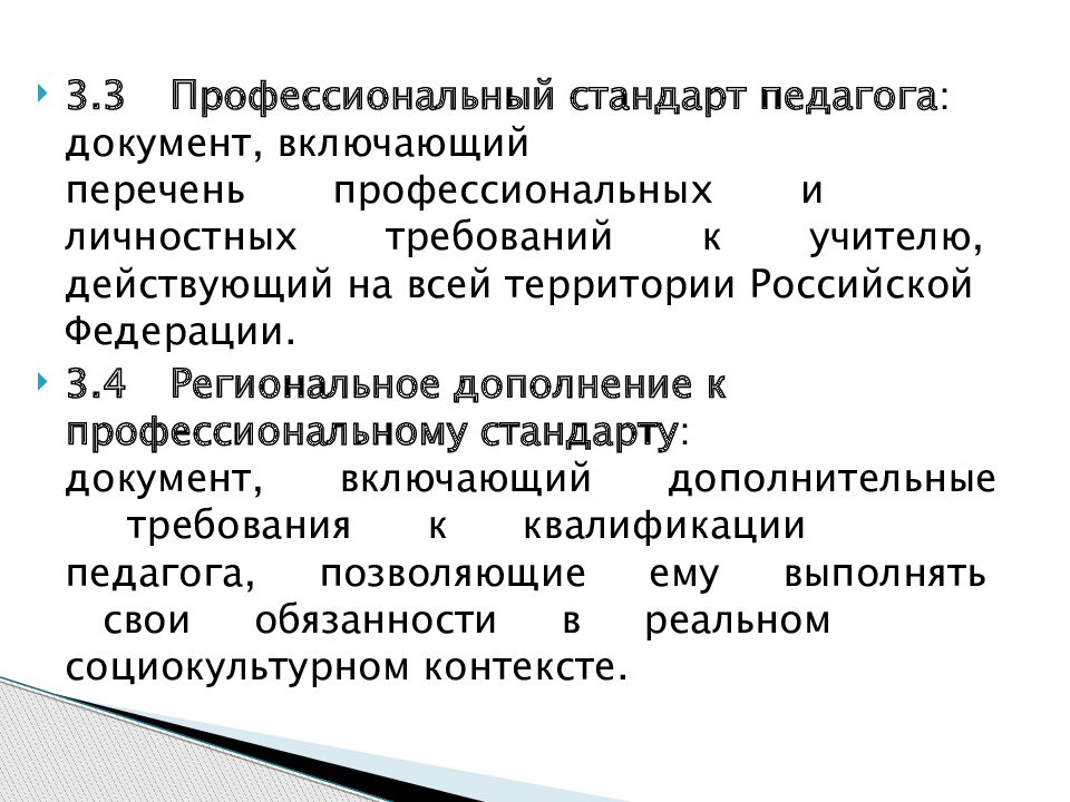 3.3 Профессиональный стандарт педагога : документ, включающий перечень профессиональных и личностных требований к учителю, действующий на всей территории Российской Федерации. 3.4 Региональное дополнение к профессиональному стандарту : документ, включающий дополнительные требования к квалификации педагога, позволяющие ему выполнять свои обязанности в реальном социокультурном контексте.