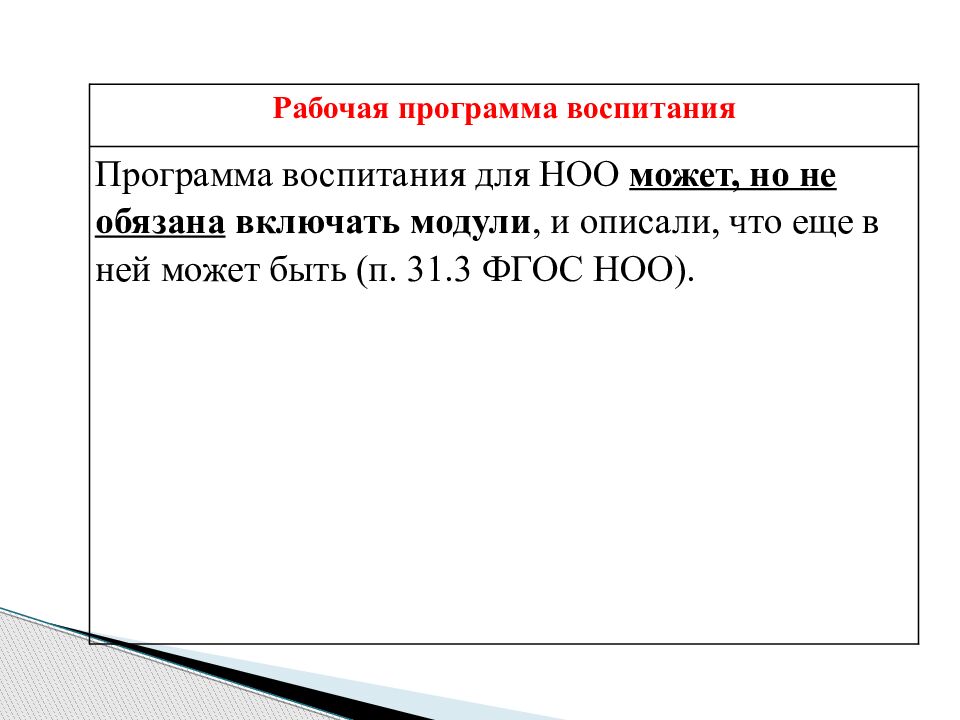 Рабочая программа воспитания Программа воспитания для НОО может, но не обязана включать модули, и описали, что еще в ней может быть (п. 31.3 ФГОС НОО).