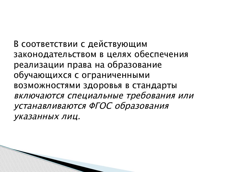 В соответствии с действующим законодательством в целях обеспечения реализации права на образование обучающихся с ограниченными возможностями здоровья в стандарты включаются специальные требования или устанавливаются ФГОС образования указанных лиц.
