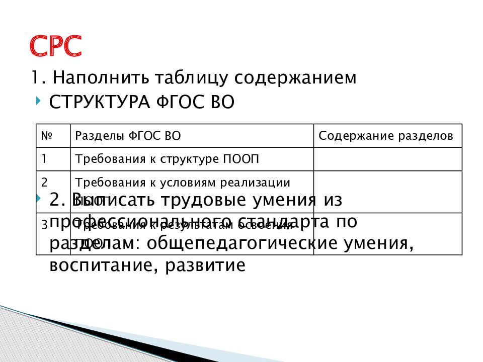 1. Наполнить таблицу содержанием СТРУКТУРА ФГОС ВО 2. Выписать трудовые умения из профессионального стандарта по разделам: общепедагогические умения, воспитание, развитие СРС № Разделы ФГОС ВО Содержание разделов 1 Требования к структуре ПООП 2 Требования к условиям реализации ПООП 3 Требования к результатам освоения ПООП