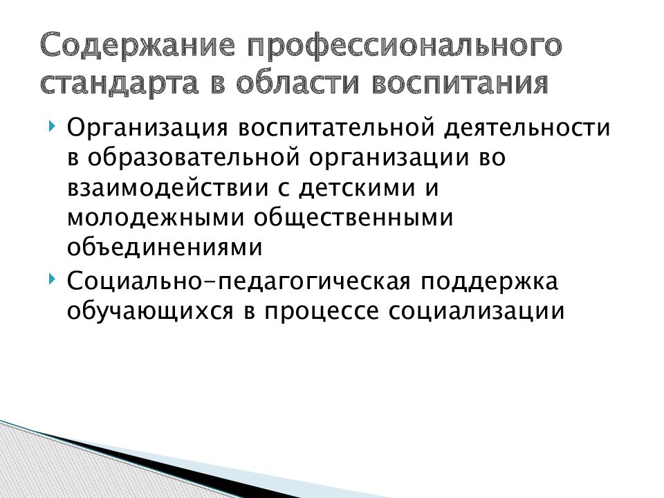 Организация воспитательной деятельности в образовательной организации во взаимодействии с детскими и молодежными общественными объединениями Социально-педагогическая поддержка обучающихся в процессе социализации Содержание профессионального стандарта в области воспитания