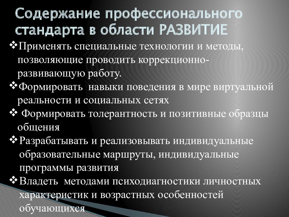 Применять специальные технологии и методы, позволяющие проводить коррекционно-развивающую работу. Формировать навыки поведения в мире виртуальной реальности и социальных сетях Формировать толерантность и позитивные образцы общения Разрабатывать и реализовывать индивидуальные образовательные маршруты, индивидуальные программы развития Владеть методами психодиагностики личностных характеристик и возрастных особенностей обучающихся