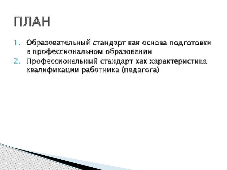 Образовательный стандарт как основа подготовки в профессиональном образовании Профессиональный стандарт как характеристика квалификации работника (педагога) ПЛАН