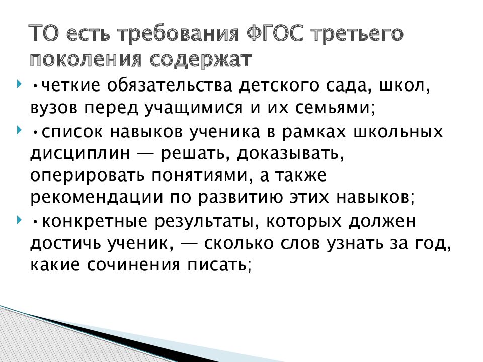 •четкие обязательства детского сада, школ, вузов перед учащимися и их семьями; •список навыков ученика в рамках школьных дисциплин — решать, доказывать, оперировать понятиями, а также рекомендации по развитию этих навыков; •конкретные результаты, которых должен достичь ученик, — сколько слов узнать за год, какие сочинения писать; ТО есть требования ФГОС третьего поколения содержат